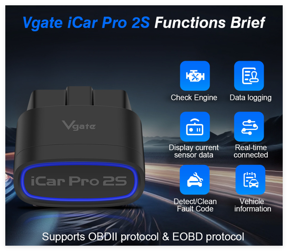 Vgate iCar Pro 2S is a Bluetooth product , Transform your iPhone, Android device, or Windows PC into a professional-grade diagnostic scan tool. The iCar Pro 2S Bluetooth OBD-II adapter can access all legal OBD-II protocols. Connect to the vehicle diagnostic seat through a plug, install client software and diagnostic software to diagnose car faults. For example, reading non-specific and manufacturer-specific fault codes, reading real-time ECU sensor data (engine speed, fuel system status, fuel pressure, oxygen sensor voltage and many other readable parameters on the vehicle) and more!